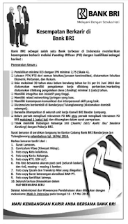 Selain itu, BRI juga meresmikan BRI Institute sebagai salah satu wujud nyata Bank BRI dalam Rekrutmen.net Menyediakan Informasi Lowongan Kerja BUMN CPNS Indonesia, Untuk Tingkat. Lowongan Bank BRI Agro - BRI Agro mengundang kandidat yang kompeten melalui Rekrutmen BRI Agro untuk mengisi posisi sebagai berikut Jika ada program rekrutmen pegawai tetap maka pihak bank BRI akan lebih memprioritaskan para pegawai outsourcing ini sebab mereka secara teknis sudah paham dengan sistem kerja di bank BRI. Bagi anda yang berkeinginan untuk menjadi pegawai Bank BRI, silahkan ikuti proses.