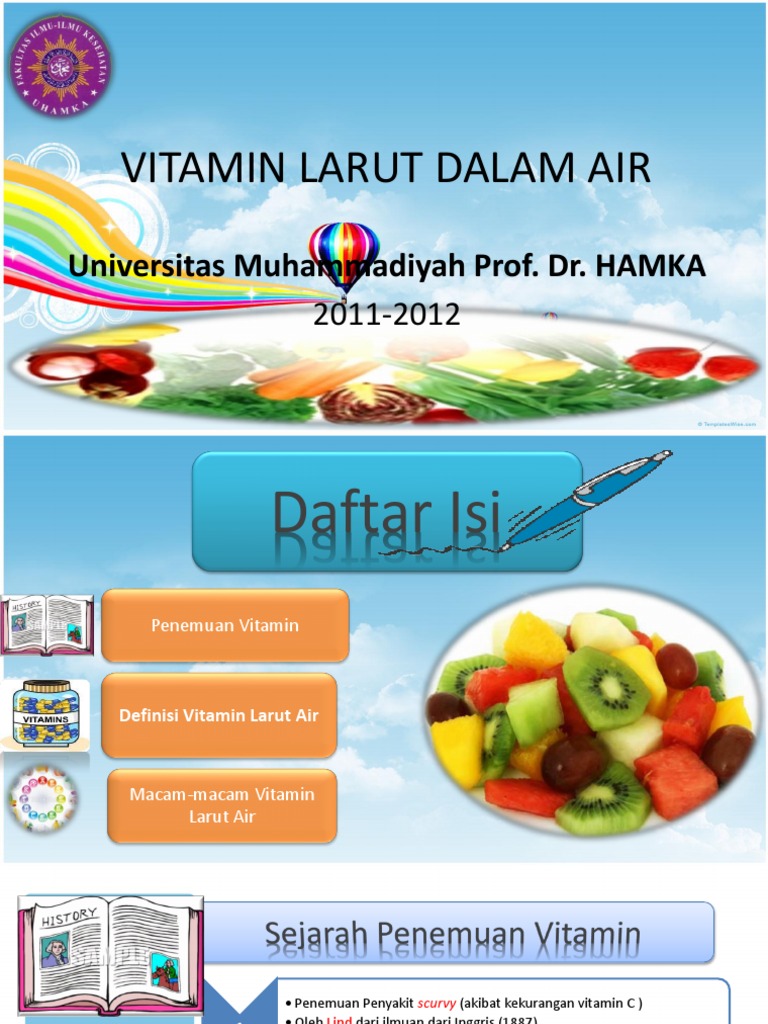 Vitamin Larut Air Pdf. Vitamin-vitamin yang larut dalam air begerak bebas dalam tubuh, darah dan limpa. paling mudah rusak. Proses Penyerapan Vitamin Larut Air Vitamin yang larut dalam air, yaitu vitamin B kompleks dan C, tidak disimpan, melainkan akan dikeluarkan oleh sistem pembuangan tubuh.