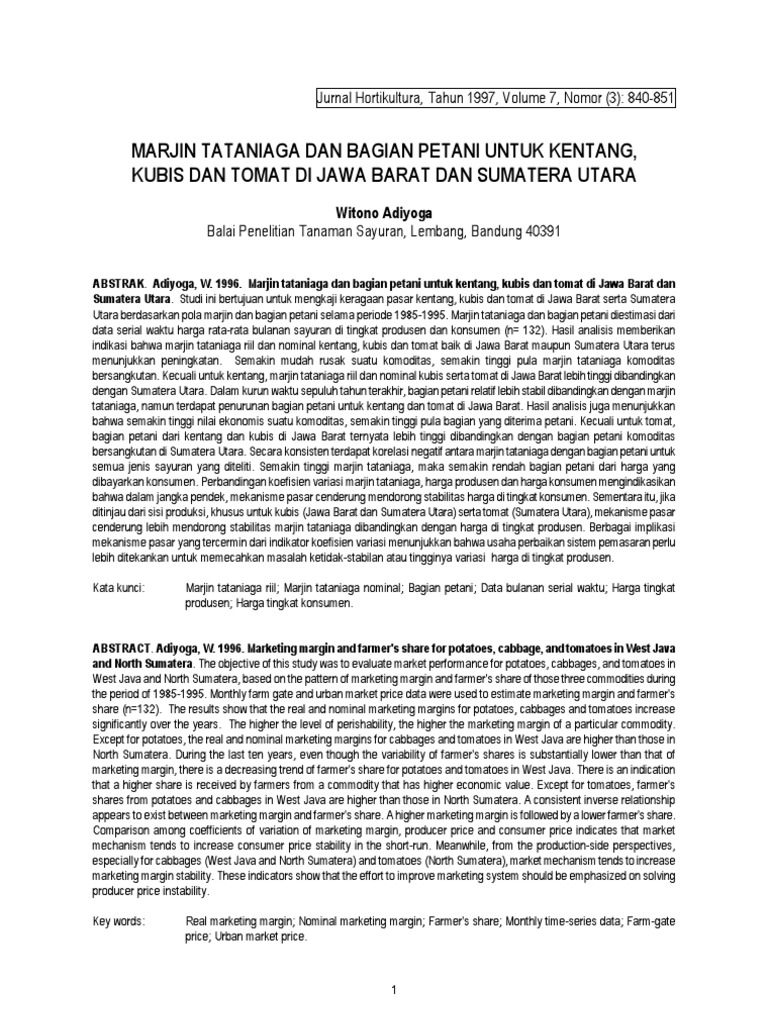 Marjin Tataniaga Dan Bagian Petani Untuk Kentang, Kubis ...